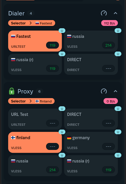 В случае, если у вас возникли какие-либо проблемы со скоростью соединения или пингом (например, в дискорде), то вы можете устанавливать соединение с серверами напрямую, не пользуясь посредником в лице сервера в РФ. Для этого переключите сервер в группе dialer на DIRECT. Однако, если никаких проблем с соединением нет, то лучше оставить все, как есть.