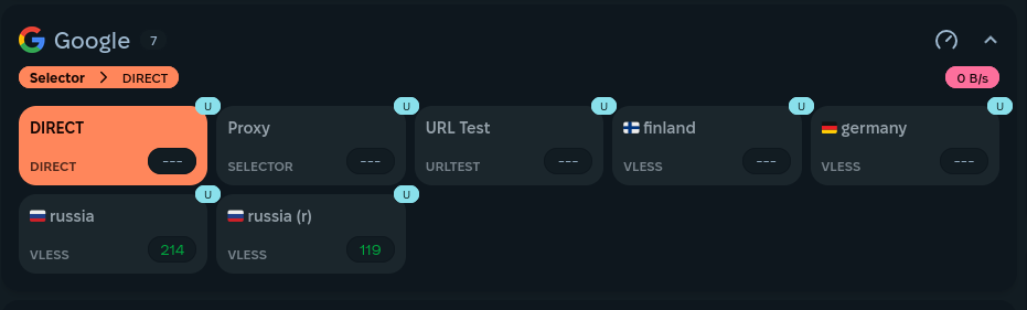 Любую прокси группу можно переключить в использование группы proxy, чтобы везде использовать один и тот же выбранный сервер, но если это понадобится, то также каждую из них можно переключить на DIRECT или любой из доступных серверов, если потребуется отдельная настройка конкретного сервиса из групп.