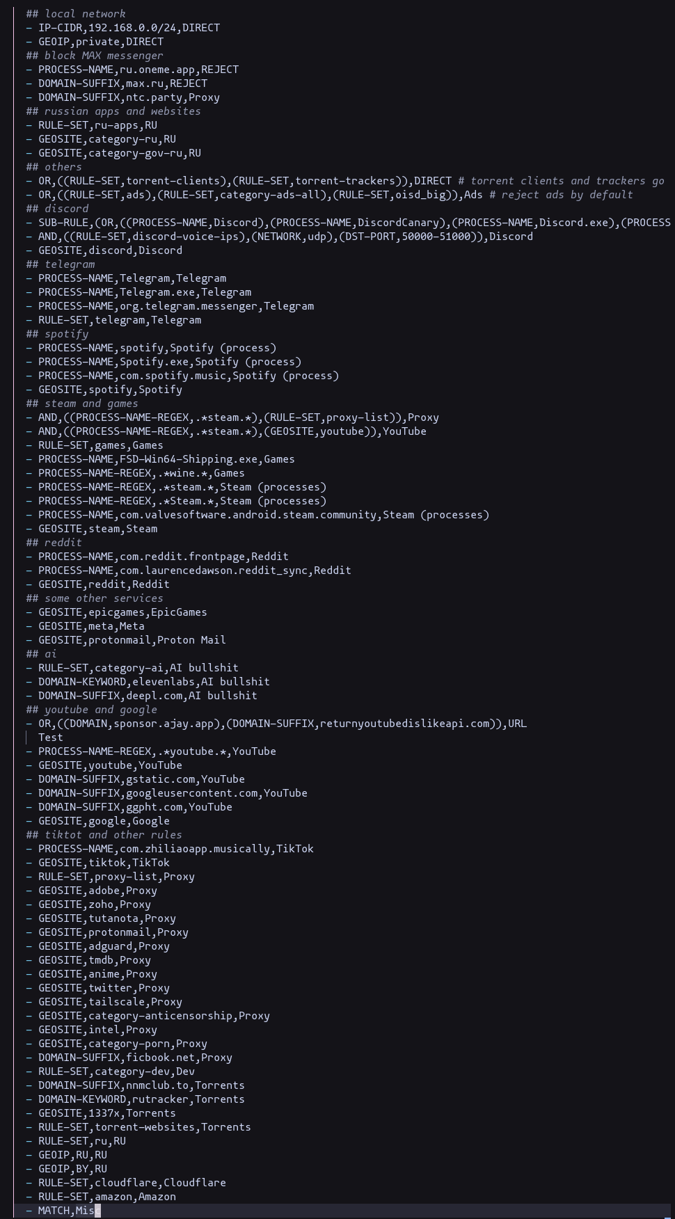 RULE-SET ruГруппа маршрутизации всех российских сайтов. По умолчанию идет напрямую (DIRECT) -